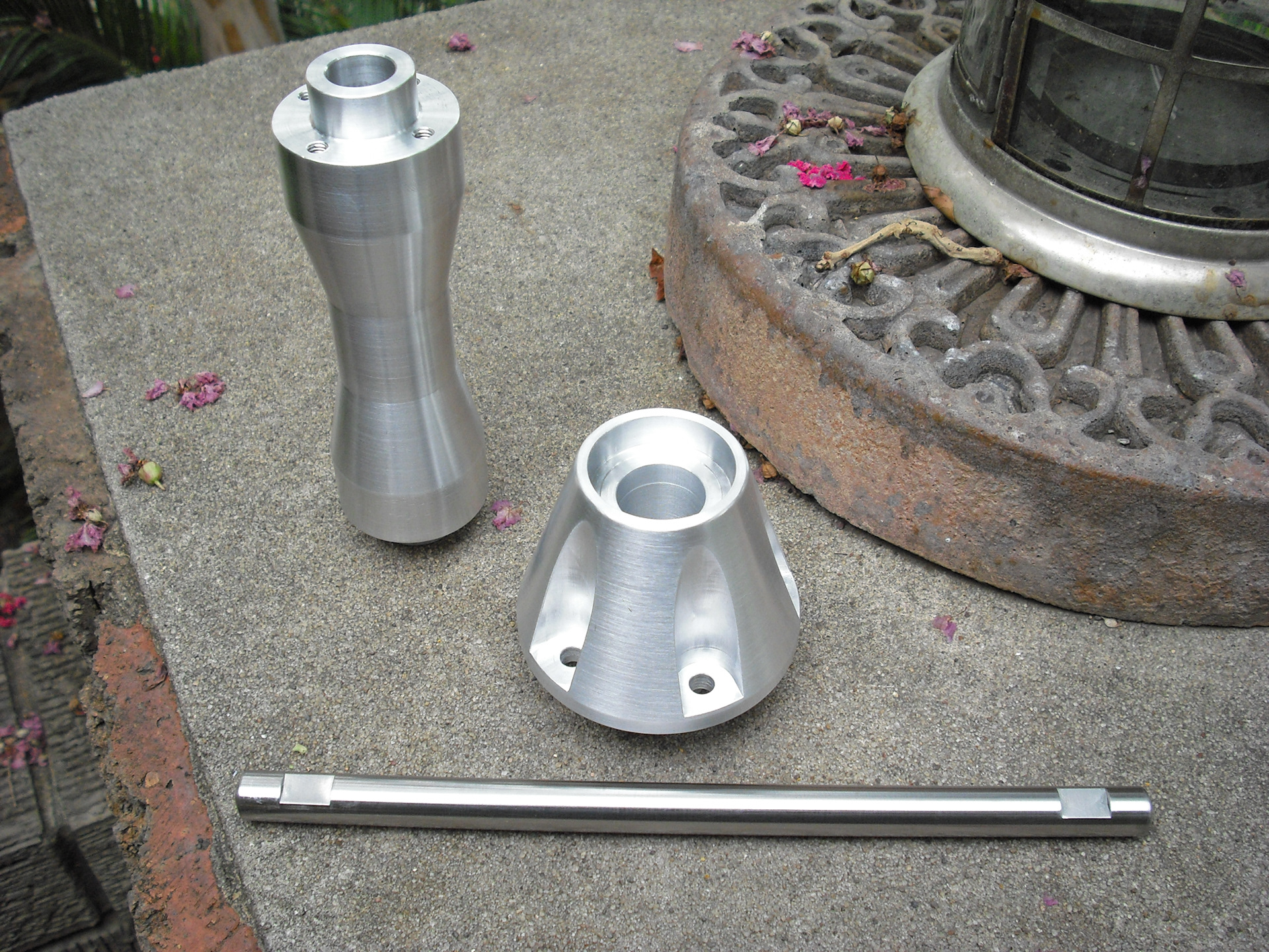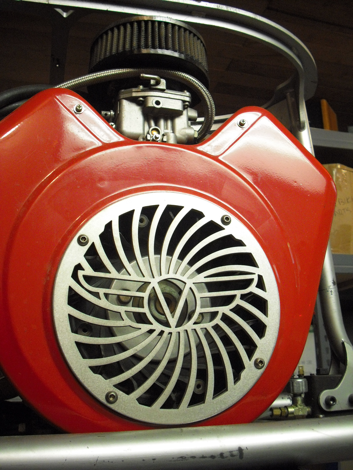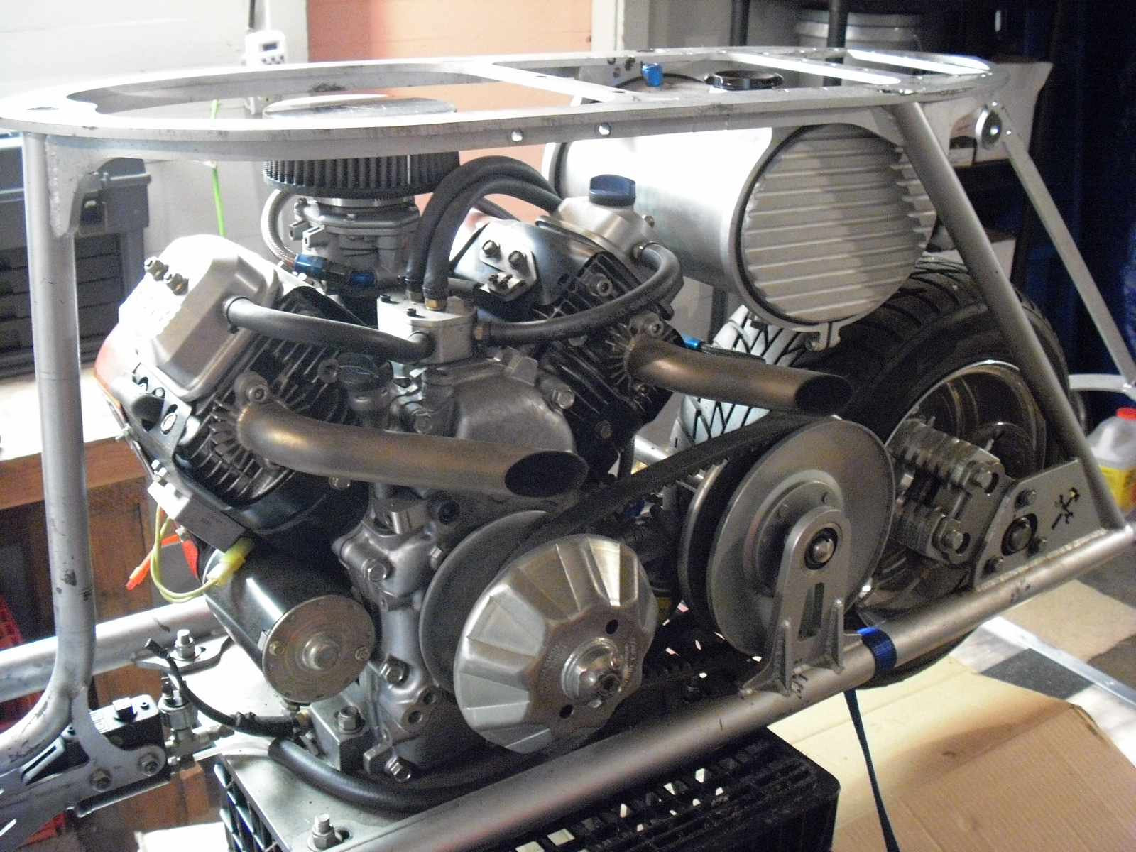 I started with establishing the constraints of the scooter design, then preceded with component selection, CAD design and then fabrication. Notable elements include: Earl's fork front suspension in titanium, a simple frame design made from water-jetted brackets and mandrel bent seamless tubing, a 400cc v-twin with custom early aircraft style short exhaust, hydraulic racing kart brakes and a Comet 40/44 CVT transmission driving a very wide rear tire.